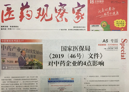 2019年9月15日《医药观察家报》刊登了我司文章“中药策划系列谈之49~国家医保局《2019(46号)文件》对中药企业的4点影响。