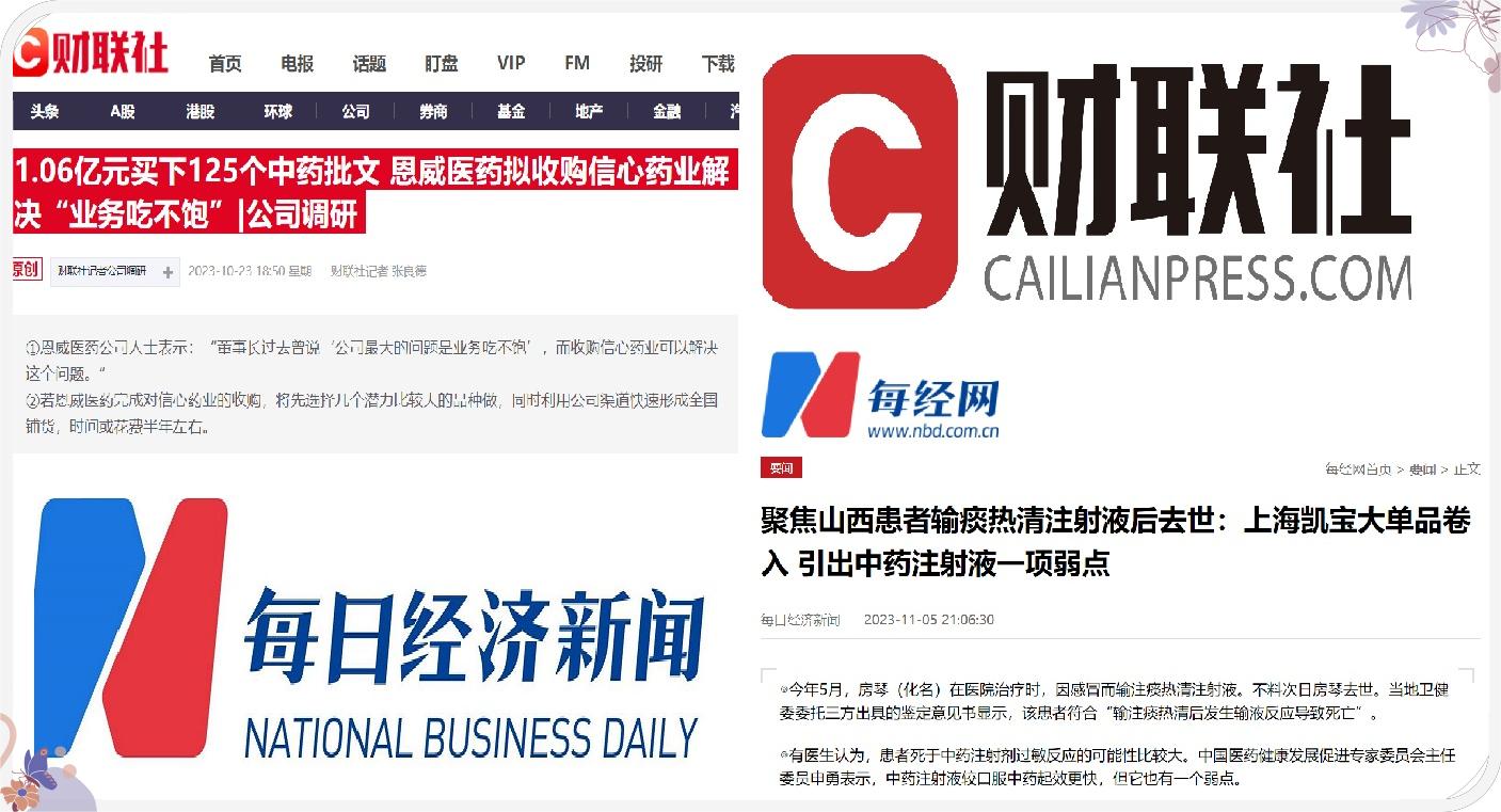 上述内容分别发表在11月5日《每日经济新闻》(题目《聚焦山西患者输痰热清注射液后去世,上海凯宝大单品卷入》 | 网址www.nbd.com.cn/articles/2023-11-05/3099872.html),和10月23日《财联社》(题目《1.06亿元买下125个中药批文、恩威医药拟收购信心药业》网址www.cls.cn/detail/1493168)。
