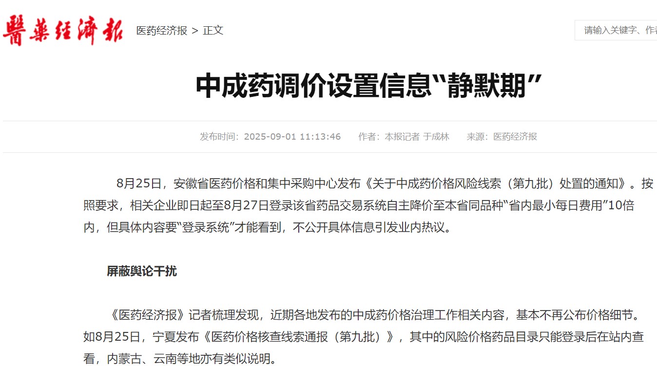 近日,我国安徽、广东、黑龙江、内蒙、陕西、宁夏等20个省相继发布了不同版本的“中药价格大检查”通知,对中药产业的发展产生了深远的影响。 就此话题,我司接受了《医药经济报》的采访,上述内容发表在2025年9月1日的《医药经济报》(网址www.yyjjb.com.cn/yyjjb/202509/202509011113461346_22119.shtml),文章题目是《中成药调价设置信息“静默期”》。