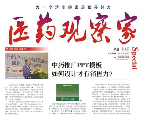 2016年5月15日《医药观察家报》刊登了我司文章“中药策划系列谈之11 –中药推广PPT模板如何设计才有销售力”。