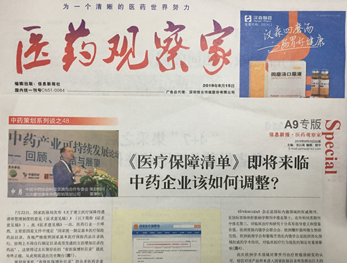 2019年8月15日《医药观察家报》刊登了我司文章“中药策划系列谈之48~《医疗保障清单》即将来临,中药企业该如何调整?
